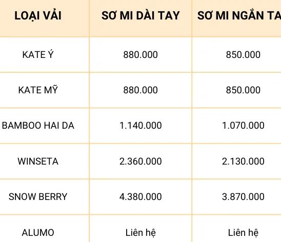 Trong bảng giá trên, có sự khác biệt về giá khi may áo sơ mi nam theo hai kiểu dáng: áo sơ mi dài tay và áo sơ mi ngắn tay. Áo sơ mi dài tay sẽ yêu cầu sử dụng nhiều vải hơn và quy trình may cũng phức tạp hơn. Tương tự, áo sơ mi có thiết kế phức tạp sẽ yêu cầu sử dụng nhiều vải hơn.